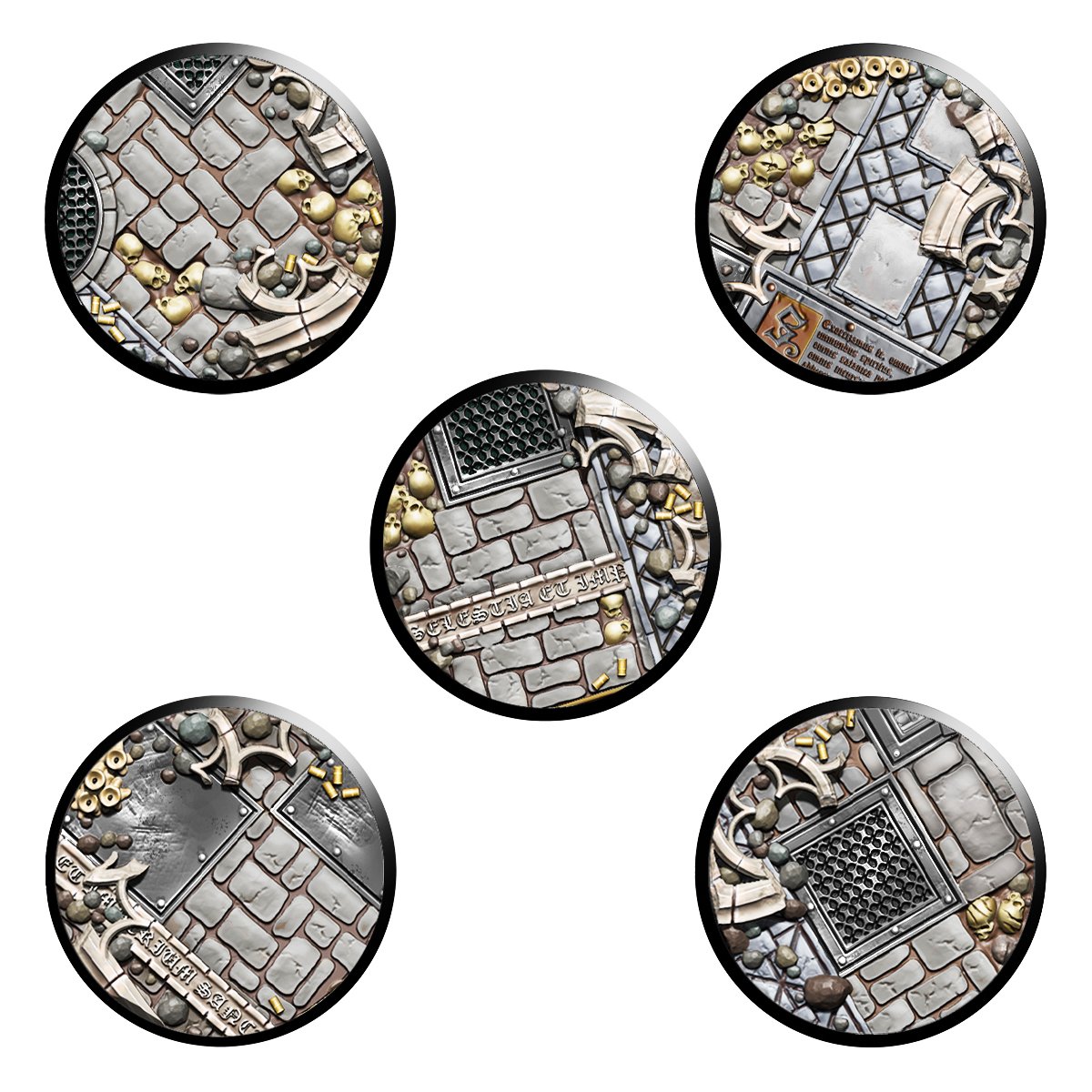 – 5 40mm IMPERIAL CHAPEL RUIN textured base covers and 5 40mm plastic bases.