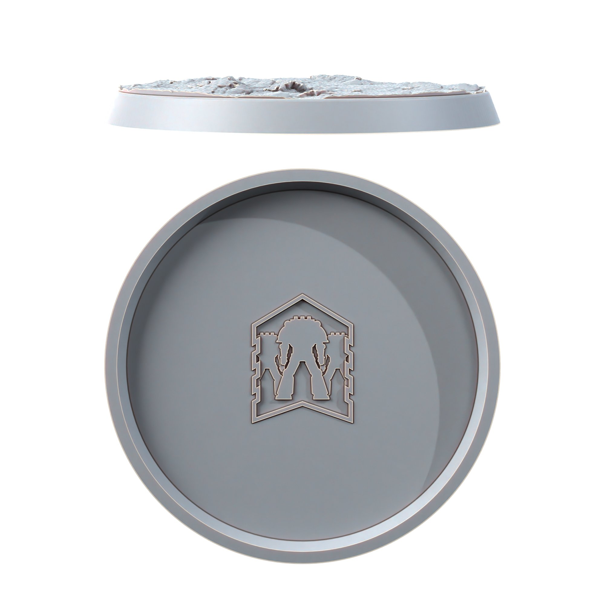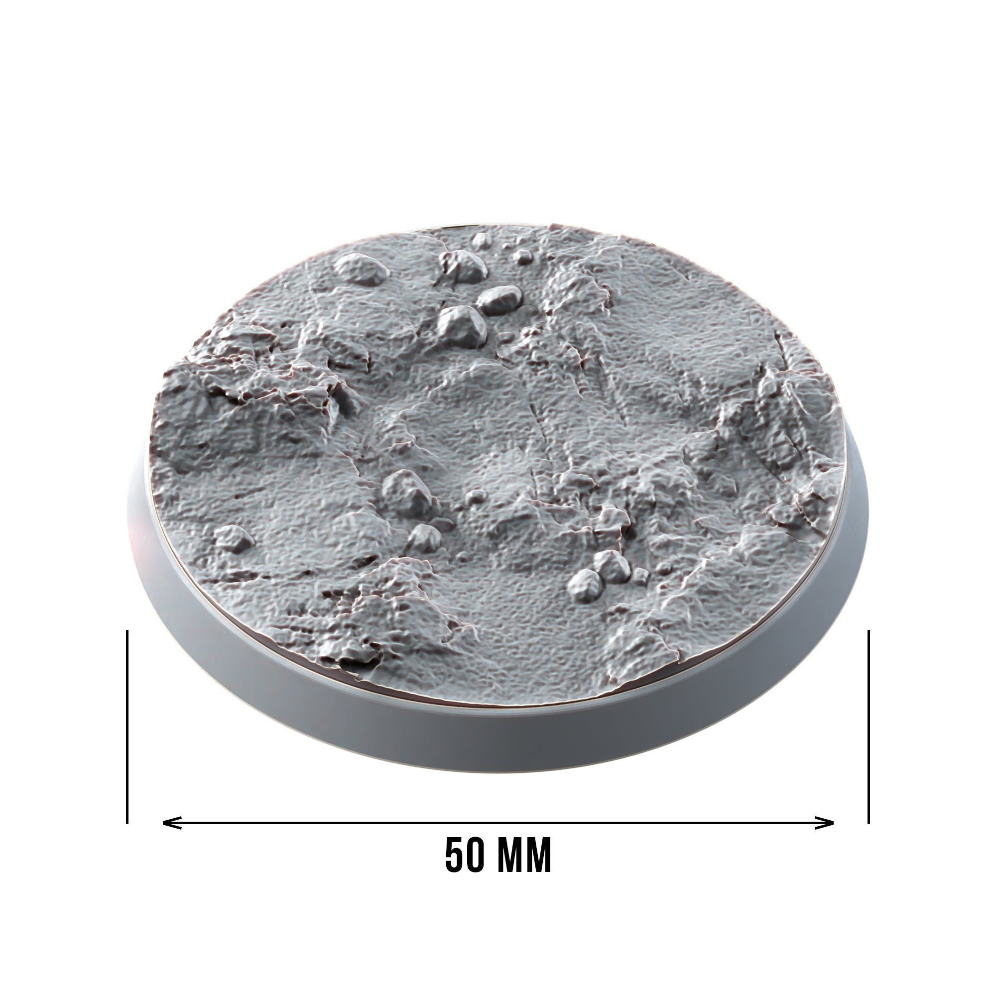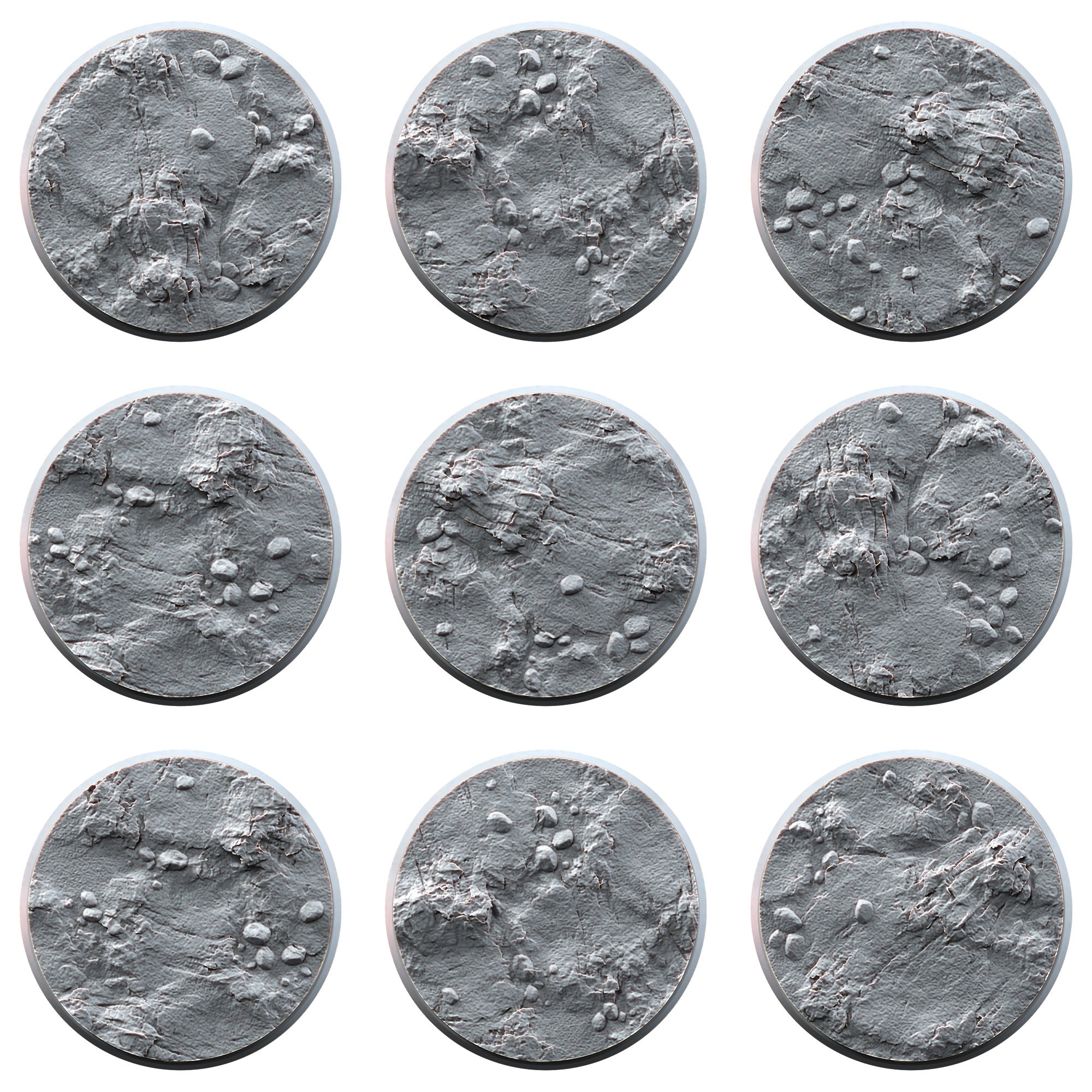 This pack contains 9 plastic 50mm textured round bases.