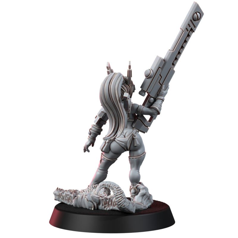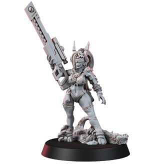 Y’oko does not conform to the typical image of a warrior in a battlesuit. Instead, she stands resolute with her high-powered energy rifle, her marksmanship unmatched, piercing the very skies with her determination and skill. Her presence on the battlefield is both a tactical advantage and an inspiring sight.