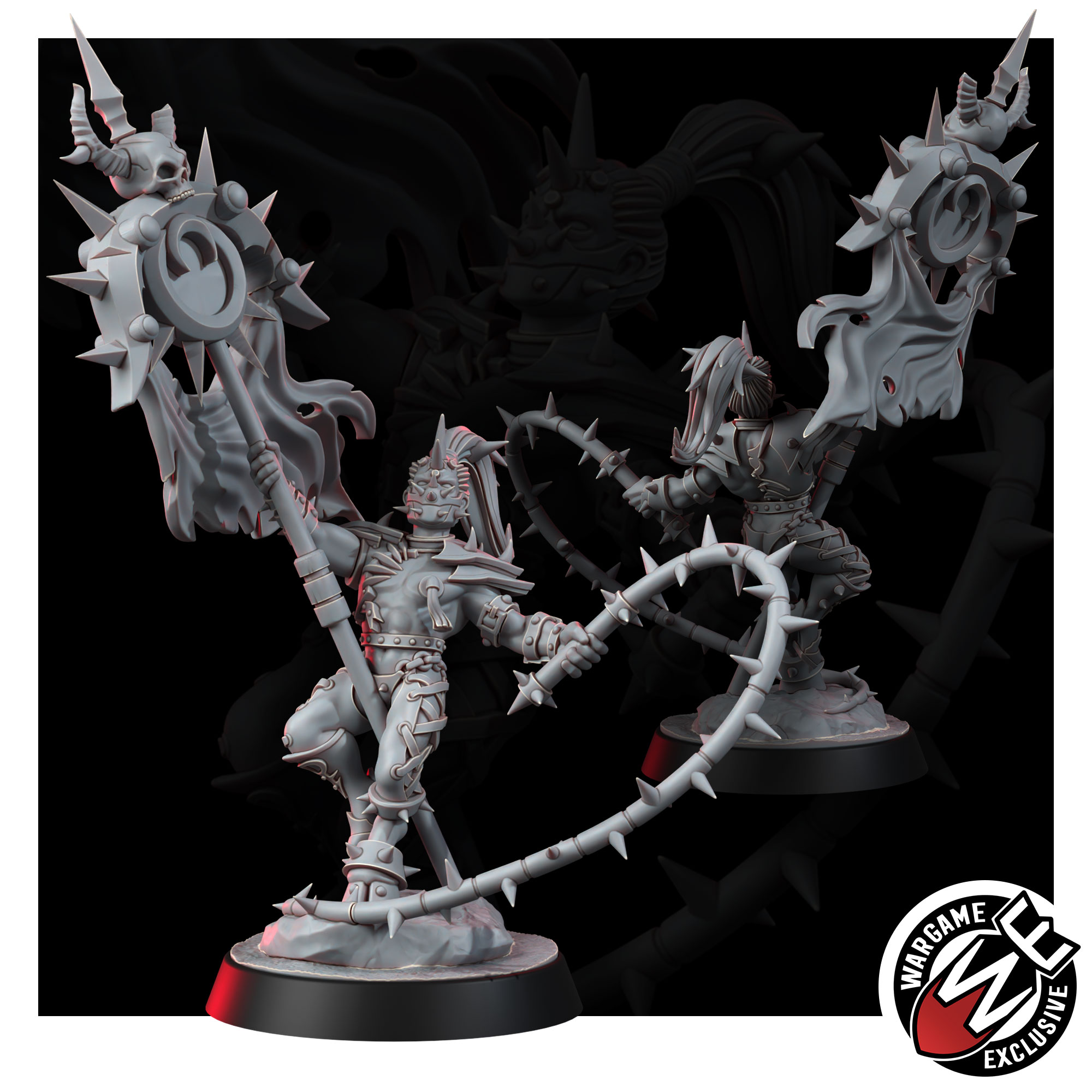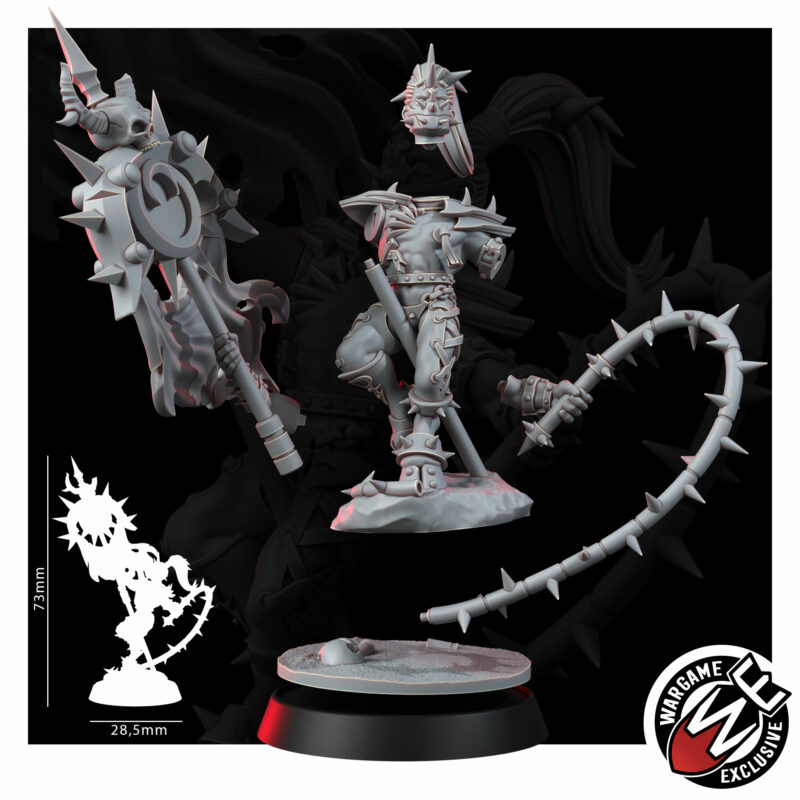 The Standard Bearer carries the warband’s icon above a bare torso – collar at the throat, thorned flail in the free hand, a body marked by rituals that don’t bear describing in anything shorter than a confession. The banner means: we chose this, we know what it costs, and we’re still here. It is planted in the ground of every battlefield they take. It is the last thing a great many people see.