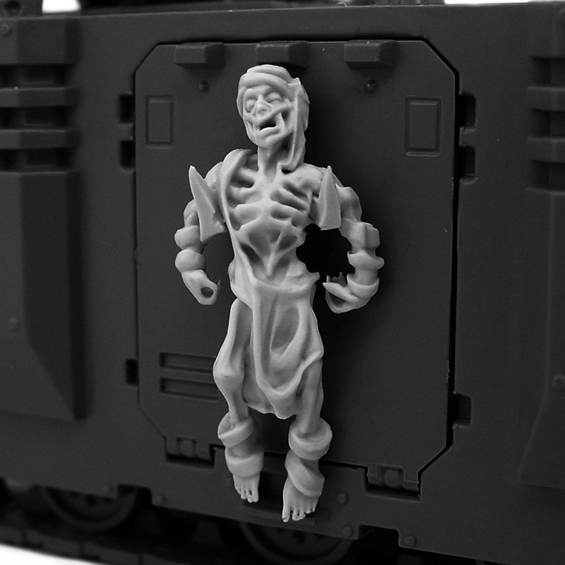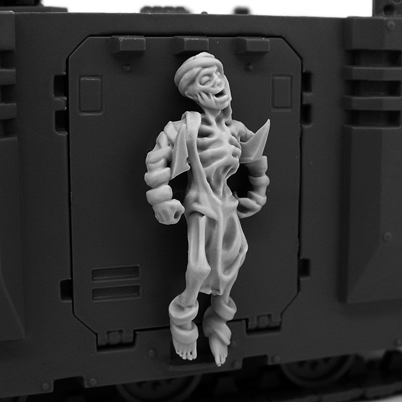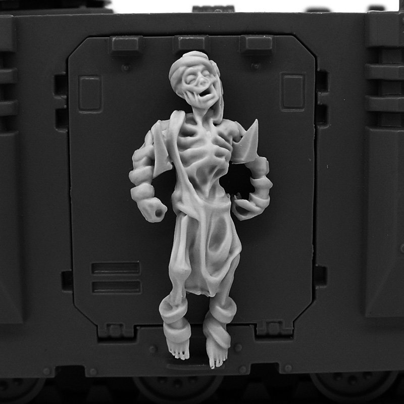 Pack of 28mm-scale conversion bits for transports or buildings.