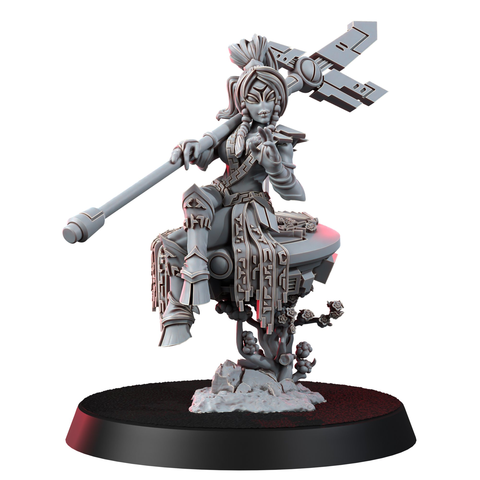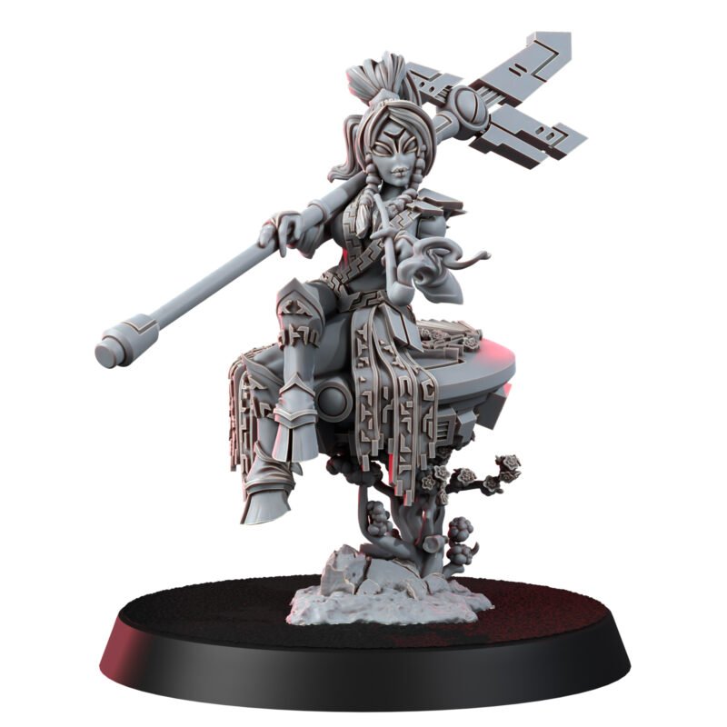 Intricately detailed and steeped in the aesthetic sensibilities of the Greater Good’s Nipponesque style, this figure is a harmonious blend of minimalistic beauty, complex tradition, and the Greater Good’s overarching philosophy. Observe the poised figure, seemingly lost in a meditative trance as she inhales the soothing vapors from her elongated pipe, all the while hovering effortlessly above a blooming tree with her trusty drone. This tableau captures a fleeting moment, where a warrior takes respite from the conflicts of the galaxy to find inner peace.