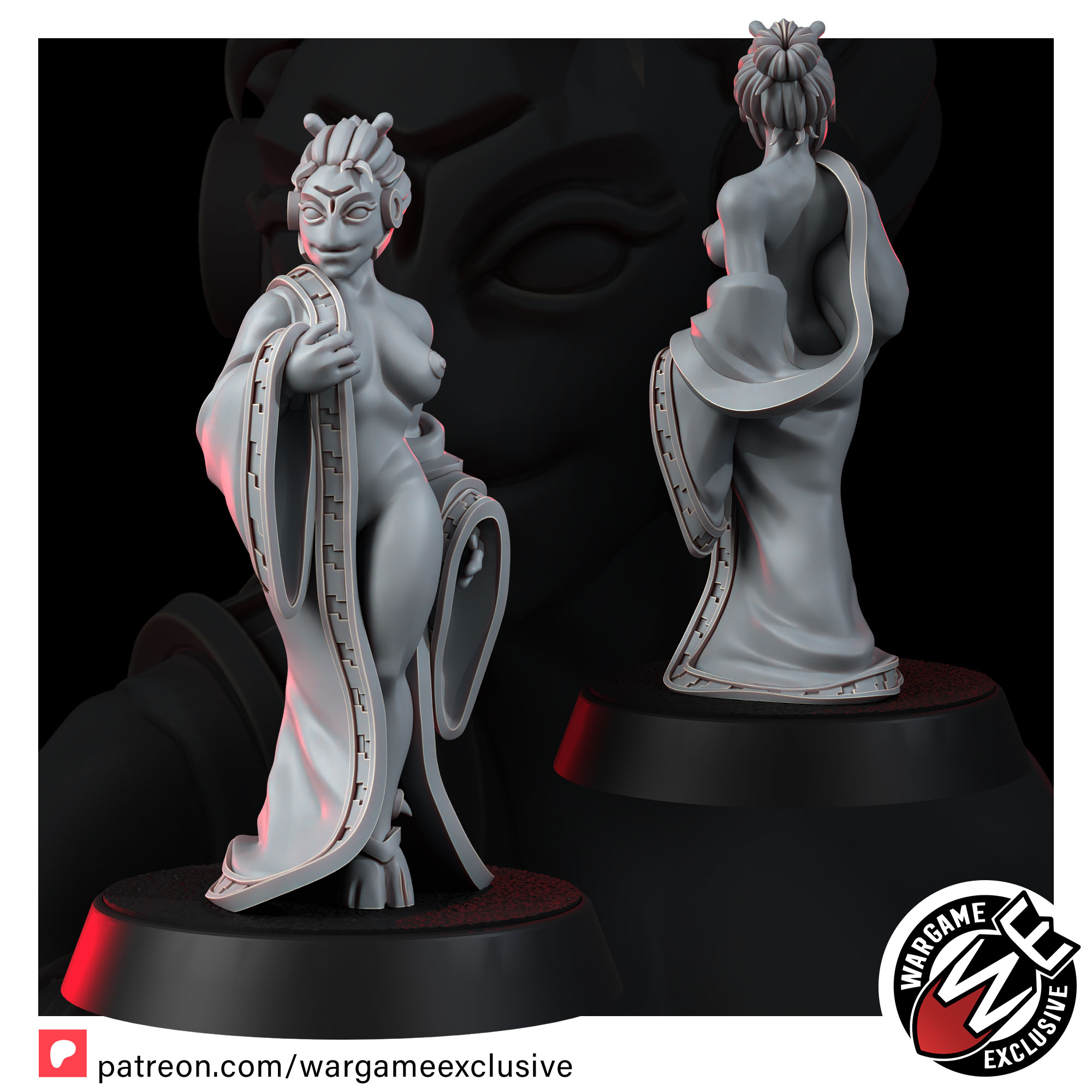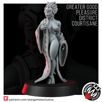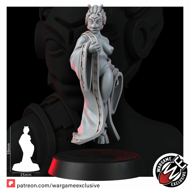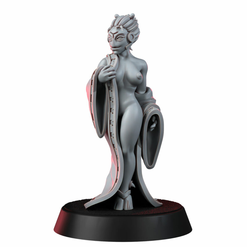 She stands wrapped in a veil-thin robe, caught in that quiet moment where story and possibility blur. Is she a honeypot spy sent to pry secrets from a careless officer, or a celebrated courtesan from the Pleasure Districts, waiting behind paper screens and soft lantern light? Maybe she’s the sharp-eyed maman of a discreet brothel, or a crime family’s matriarch disrobing in private for a young lover who doesn’t yet realise how dangerous she is. She could just as easily be a local feudal concubine between ceremonies, or simply a woman alone in her ryokan quarters, preparing for a bath and a long meditation after another day under the Greater Good’s watchful gaze.
