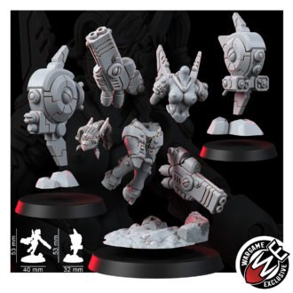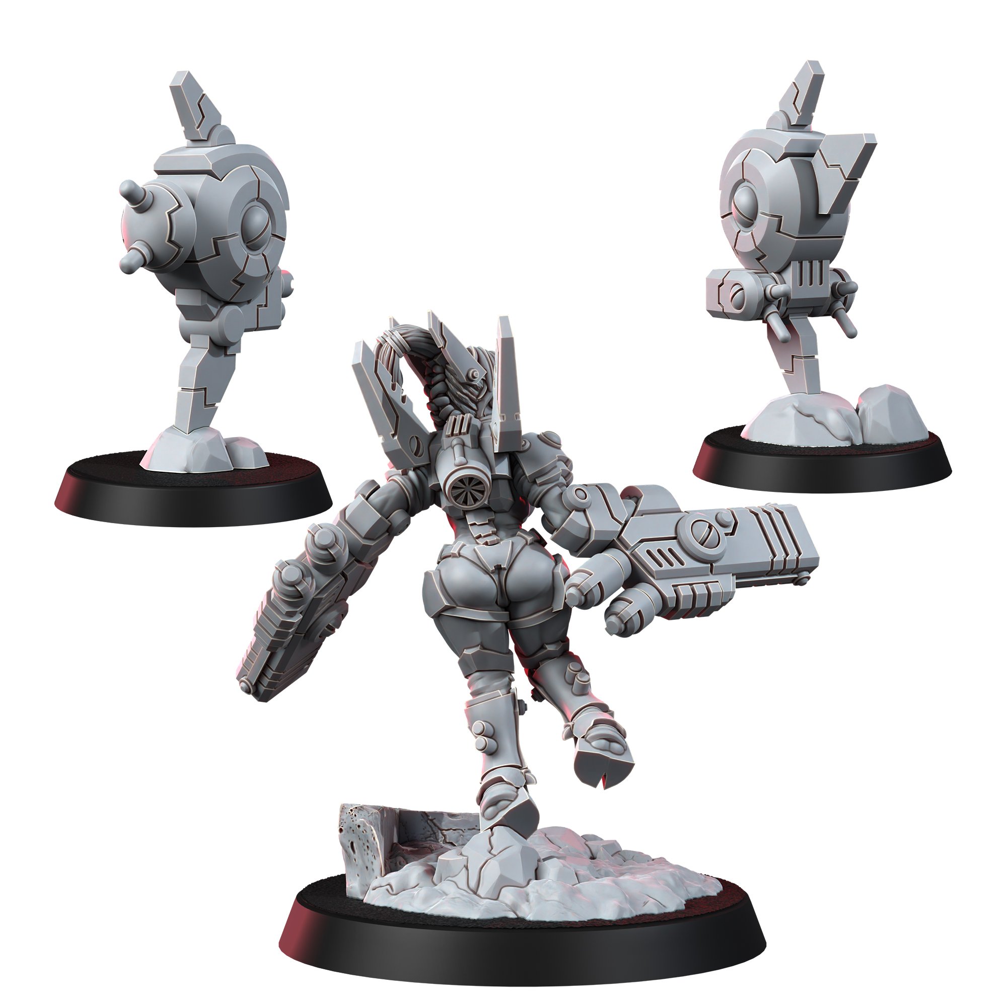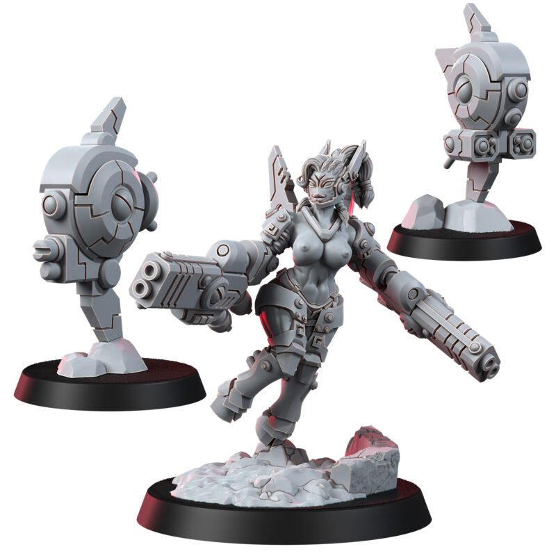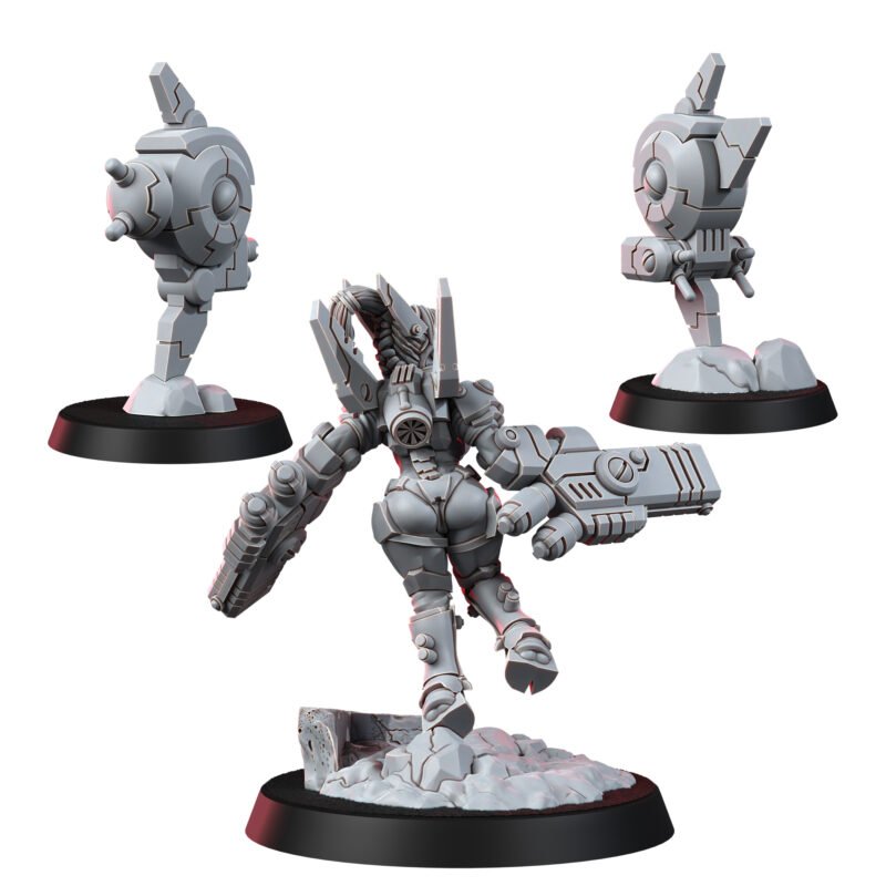 Battle Drones: These two drones at her side are her ever-vigilant companions, equipped to defend and attack, augmenting her already formidable presence.