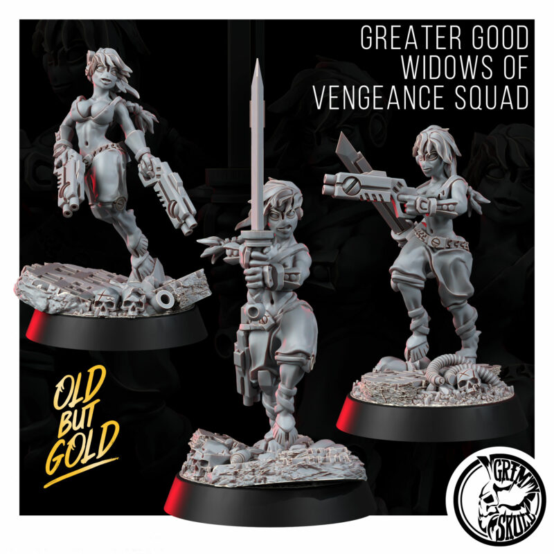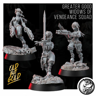 The Greater Good Widows of Vengeance Squad are former battlesuit pilots whose war-engines were annihilated in combat. To them, the suit was not merely armor or weapon – it was a partner, a sworn union of flesh and machine. When that bond is severed in an instant of catastrophic destruction, the pilot is declared a Widow.