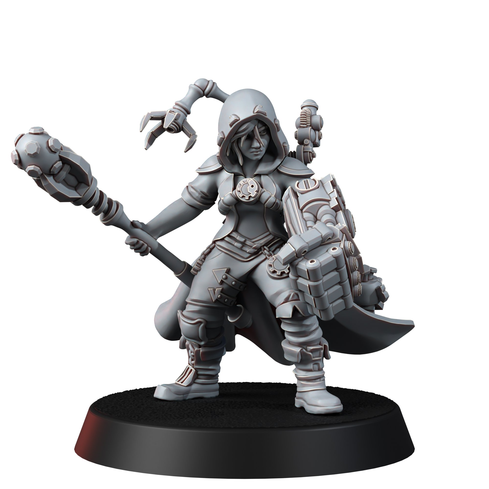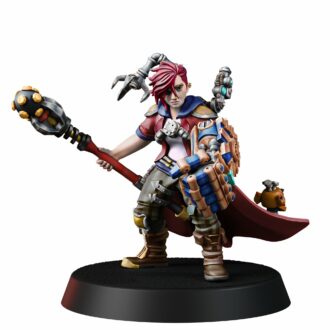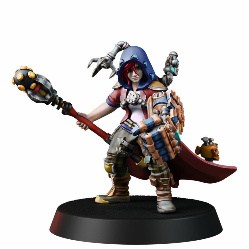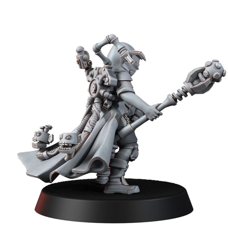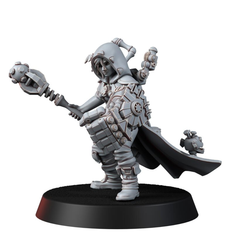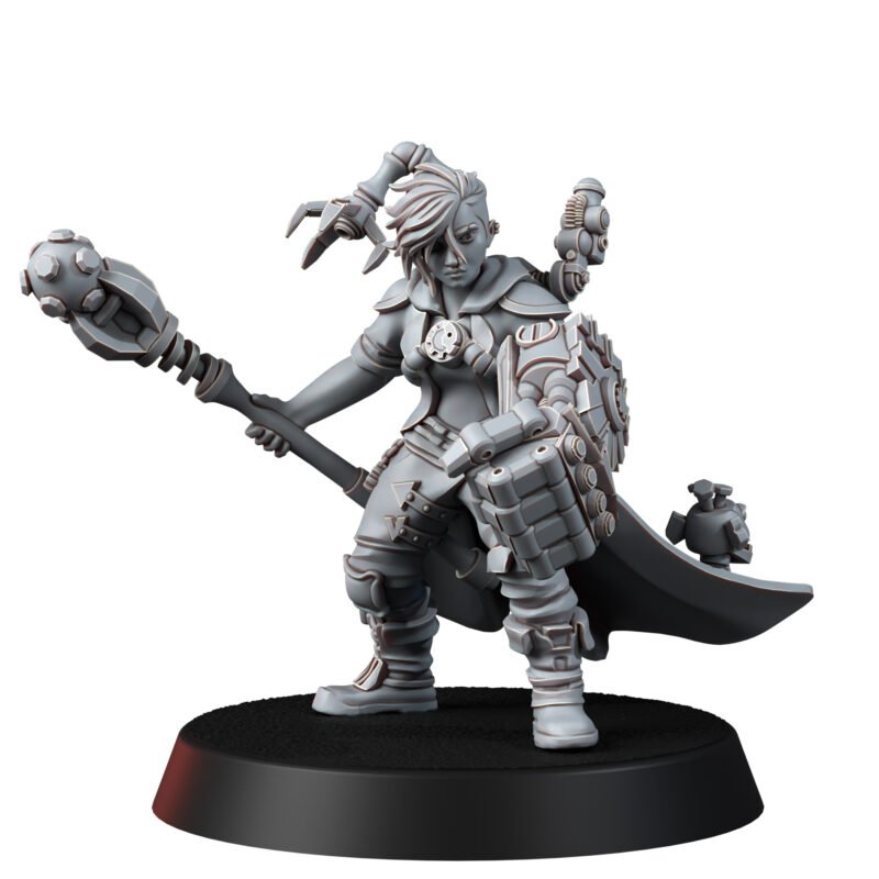 TECH PRIEST MK-VI combines a rebellious spirit with unwavering faith in the greatness of technology. Her left arm is transformed into a massive power fist, capable of shattering even the strongest barriers, while her right hand wields an intricately designed techno-staff, crackling with electricity and ancient codes that command machines.