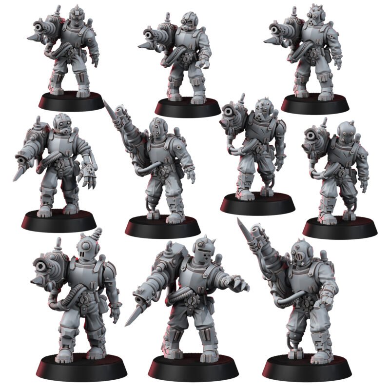 With the release of this ten-model set, the Mechanic Adept TECHNO ZOMBIES with THERMO LASER are ready to join your ranks, promising unending vigilance and merciless efficiency. The shadows of treachery will be eradicated, one incinerating beam at a time, as these servitors carve a path to our glorious future with cold, calculated precision. Prepare to unleash our technological mastery and watch heretics quiver before our mechanized retribution.