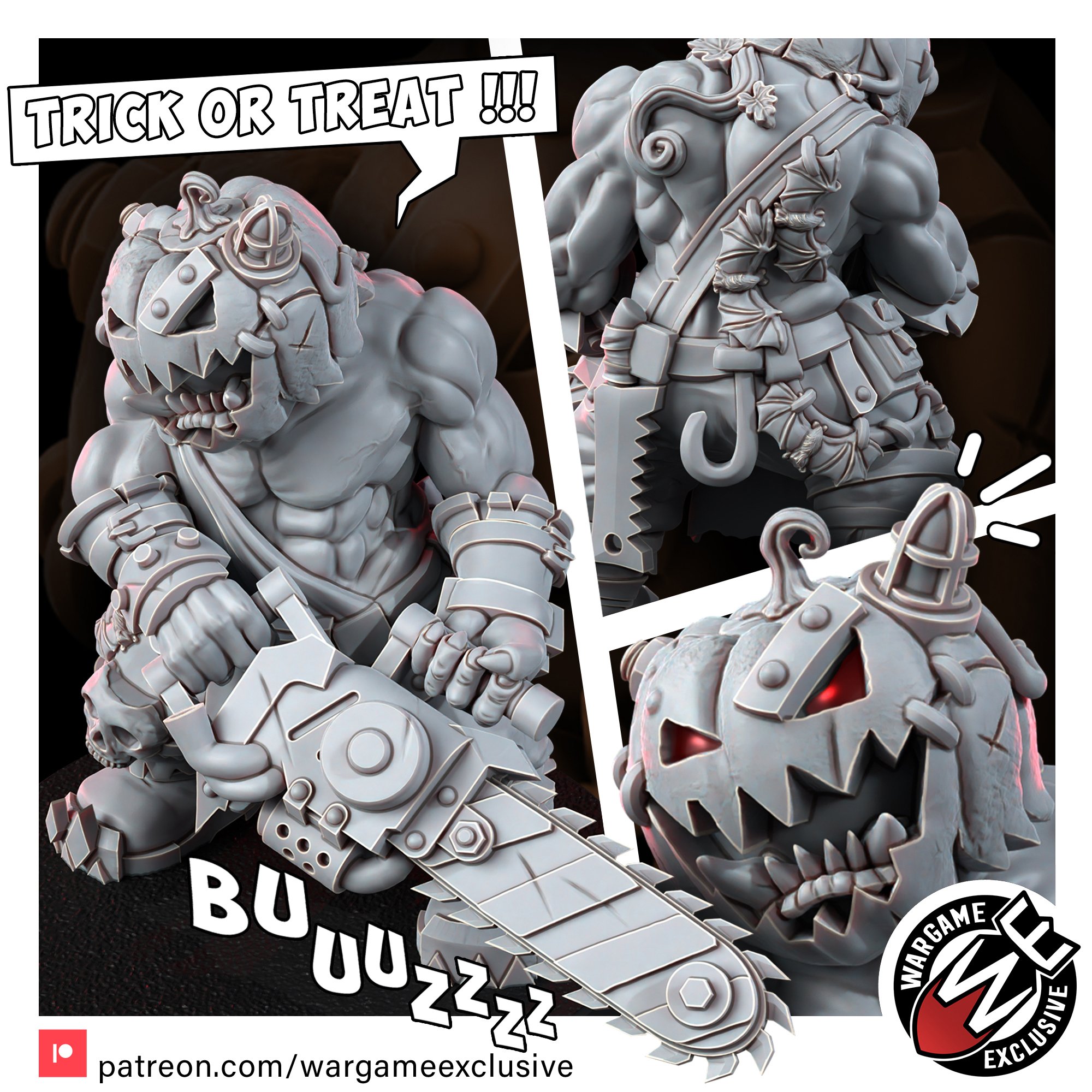 So Krusha decided to carve a massive pumpkin he found in the settlement’s fields. With his chainsaw, he carved a traditional spooky look of the human festival. After hollowing out the inside, Krusha wore it as a helmet. To the humans, it was a horrifying sight: an Ork charging at them, roaring with laughter, his face replaced by a glowing pumpkin.