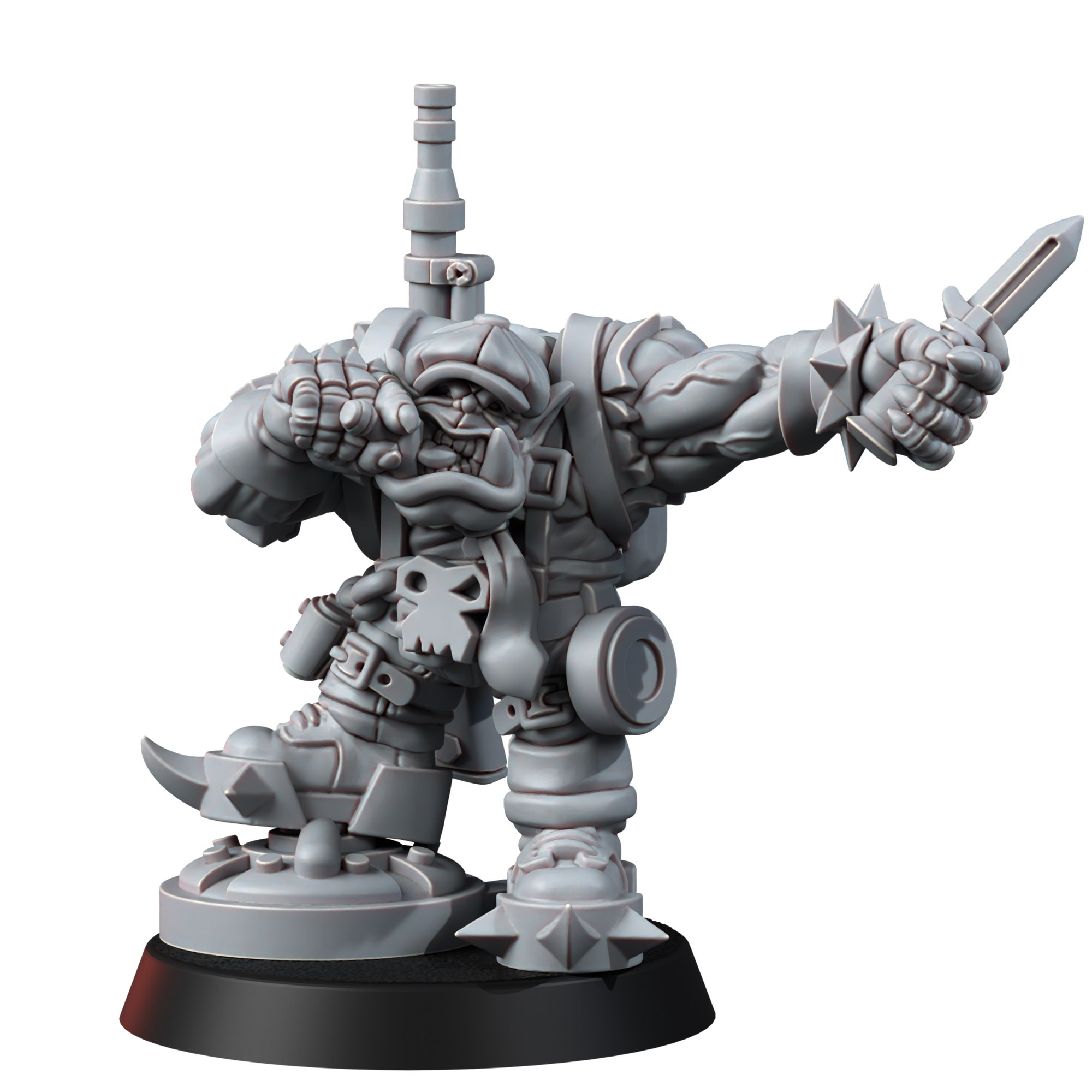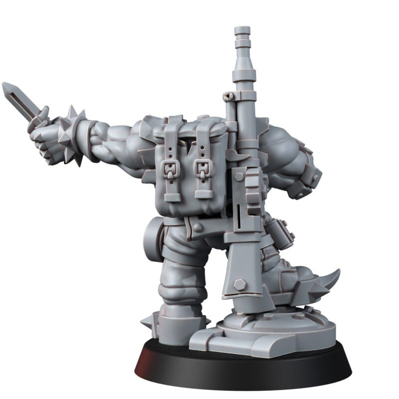 Strapped to ‘is back is a stompin’ big shoota – cuz if da knife an’ da ciggie don’t convince da ladz, da dakka surely will. His stance an’ dat sneaky grin scream one fing: “Oi, I’z da boss ‘ere, and ya betta zog off or face me Waaagh-style!”