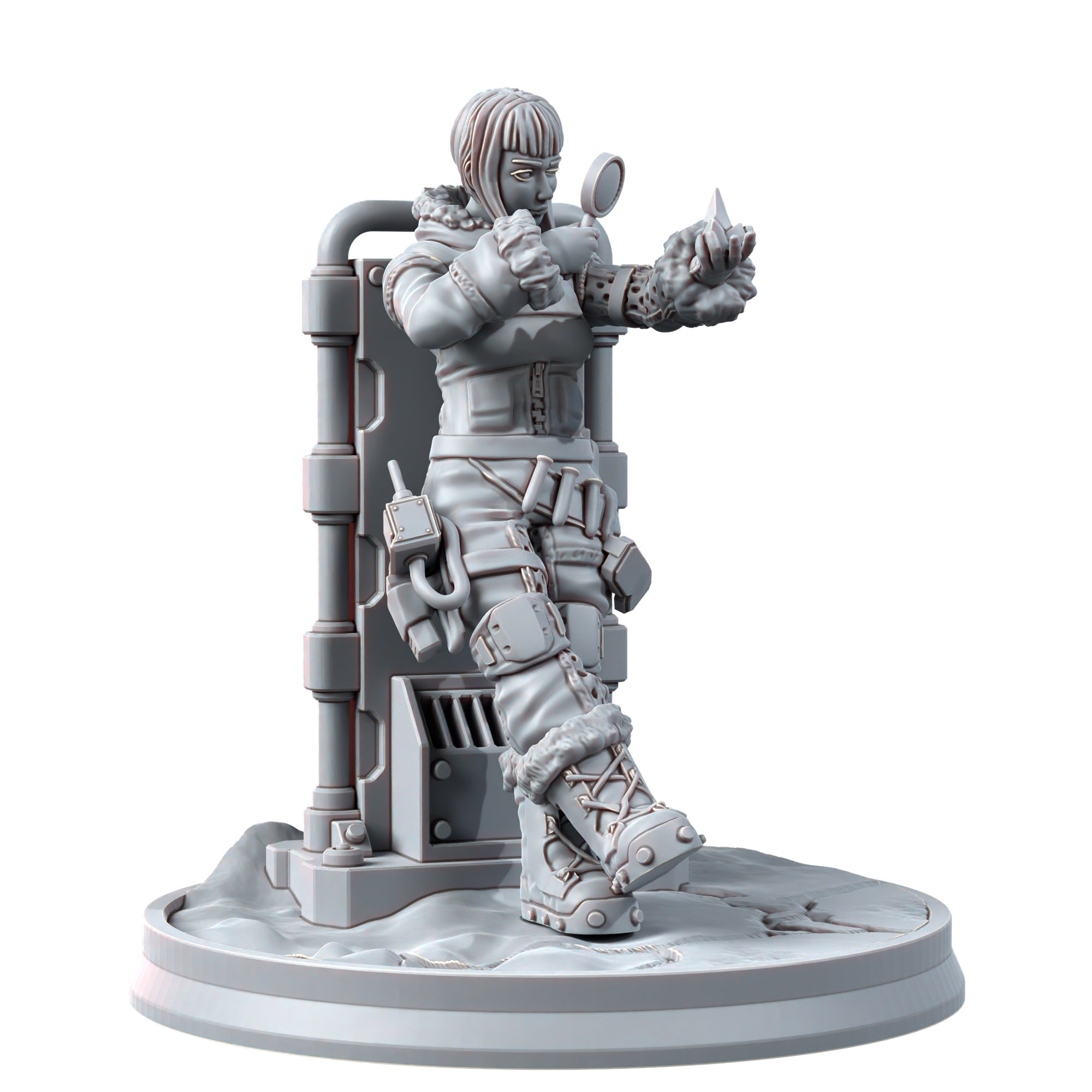 Dr Katla is an esteemed scientist from the Northern city of Heluvik, sent to the ice base on the frozen Kaltoss Plateau to investigate the alien crystals growing there. She commands the team at the Alpha Norsk facility. An NPC type character with a leaning pose.