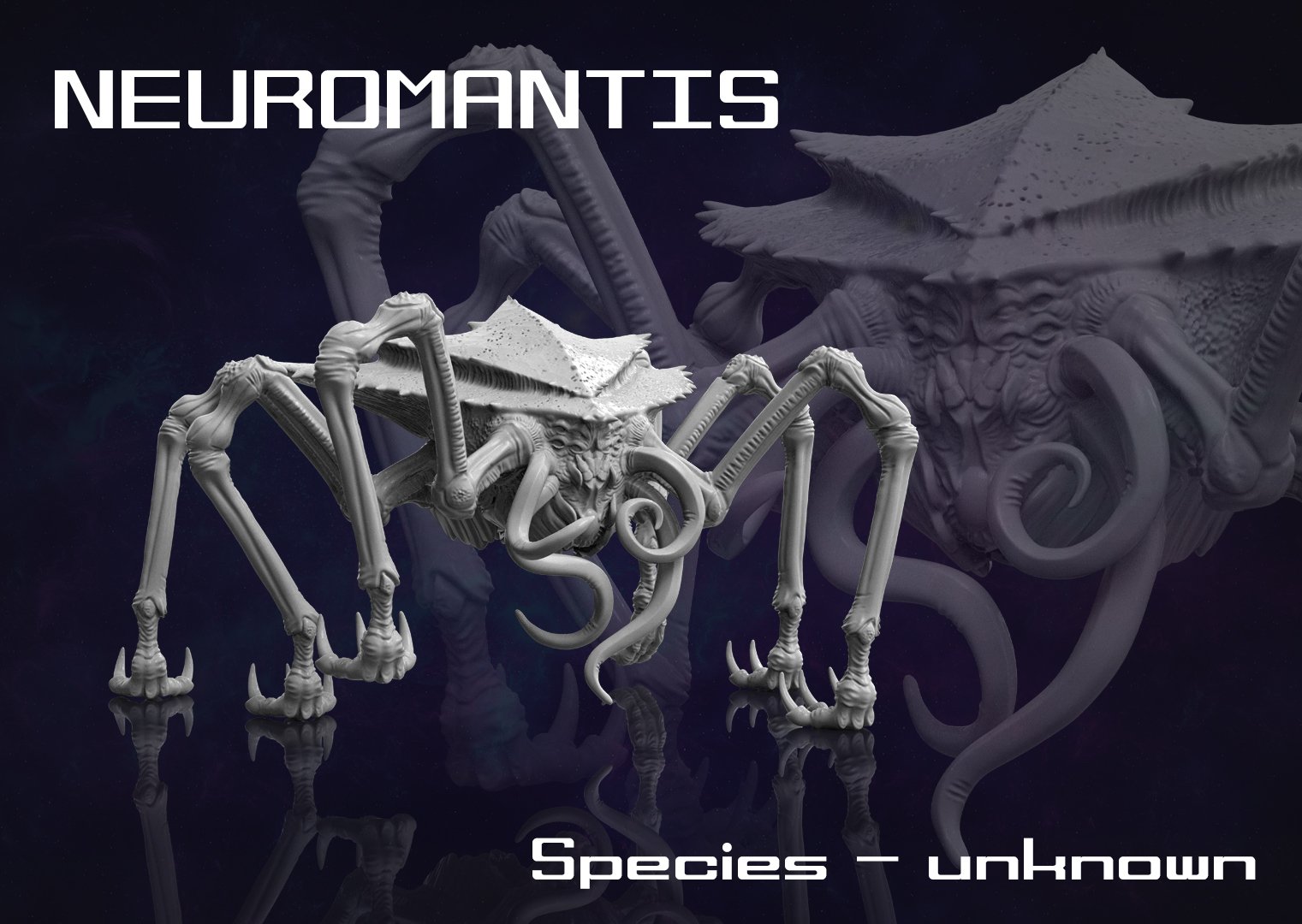The Neuromantis is an alien species found on the exoplanet Aether, Planet 579a in the Milky Way Galaxy. It’s 150 years in the future and space exploration is a commerical enterprise. Pioneer teams are sent out to habitable planets to conduct in person research of the natural resources, and to set up working settlements for colonists to arrive. Many planets are simply mined for profit and others are colonised – space is now big business.