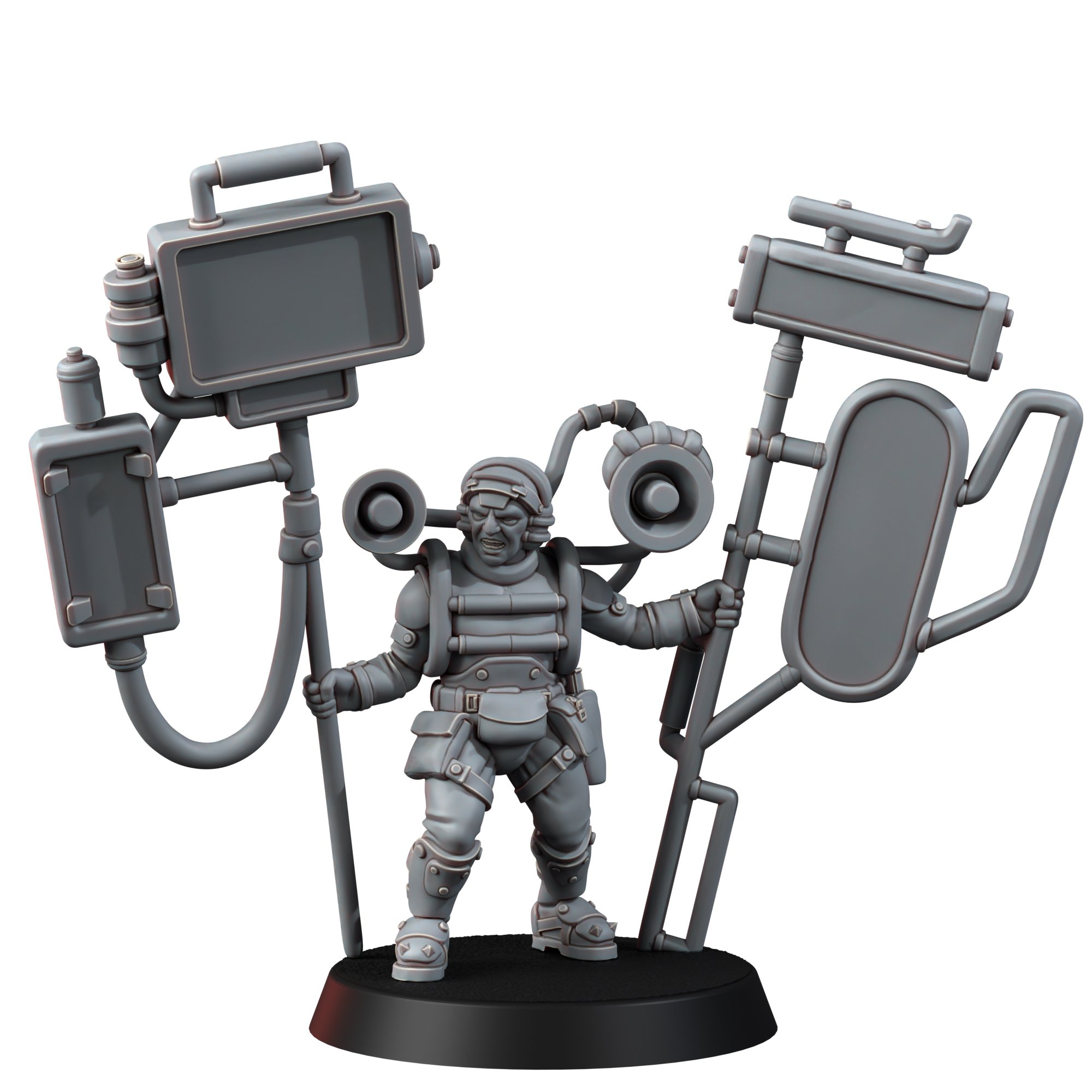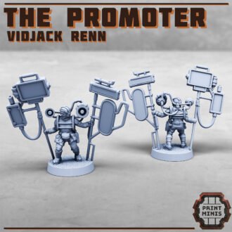 A walking broadcast tower of flickering screens and booming rhetoric, Vidjack Renn is the city’s premier mouthpiece for hire. He lumbers through the streets, hoisting towering vid-displays that spit out endless loops of propaganda, mandates, or whatever message his employer wants hammered into the minds of the masses. His words are polished and persuasive, but those who know him say there’s nothing behind his eyes-just a blank stare, waiting for the next script.