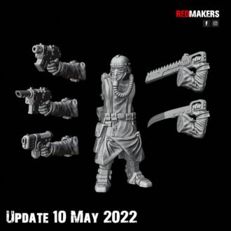 The SERGEANT can be equipped with a LASPISTOL, a BOLT PISTOL, or a PLASMA PISTOL, and either a CHAINSWORD, or a POWER SWORD.