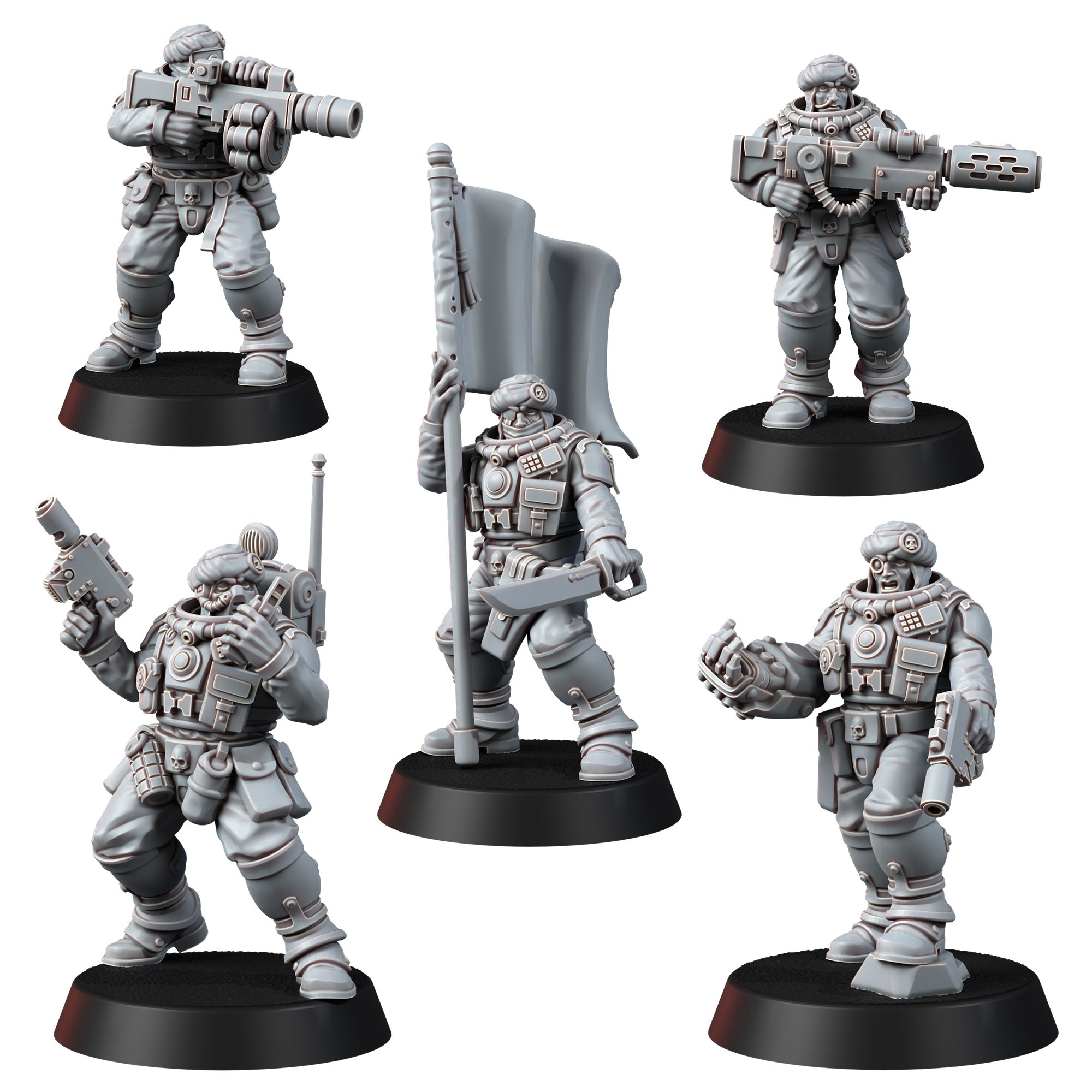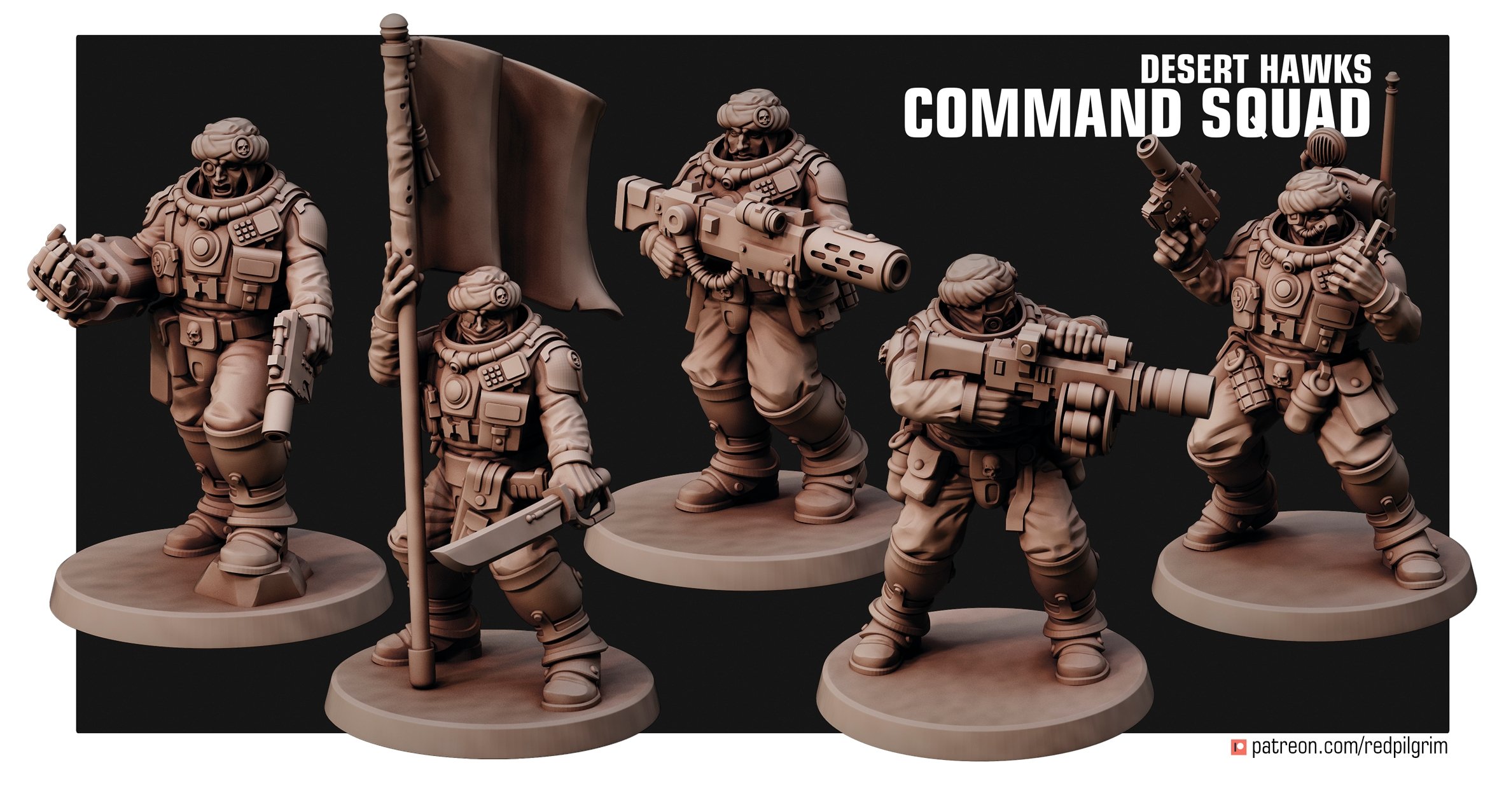 IMPORTANT! This set allows you to build DESERT HAWKS COMMAND SQUAD, including a COMMANDER with a POWER FIST (or with a CHAINSWORD) and a LASPISTOL, a STANDARD BEARER, a RADIO OPERATOR and a 2 VETERANS WITH SPECIAL WEAPONS (a GRENADE LAUNCHER, a FLAMER and a MELTGUN).