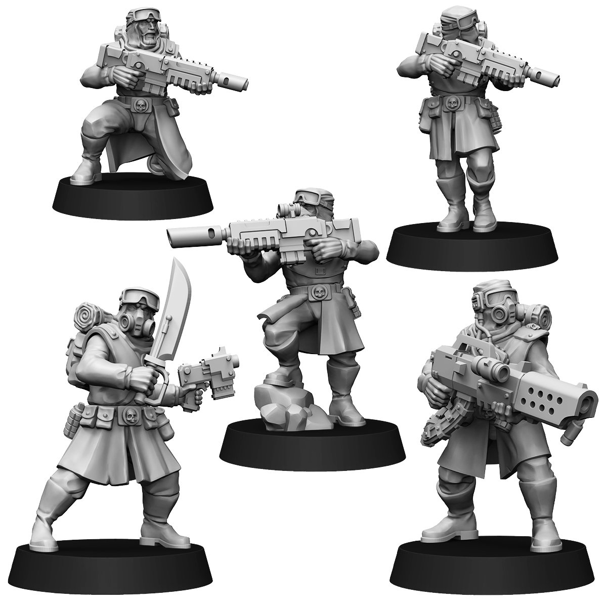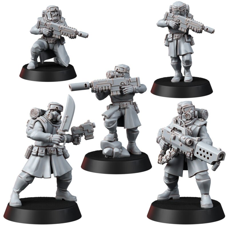 This set includes five figures (32 mm). Each consists of a torso+head, legs, arms with weapons.
