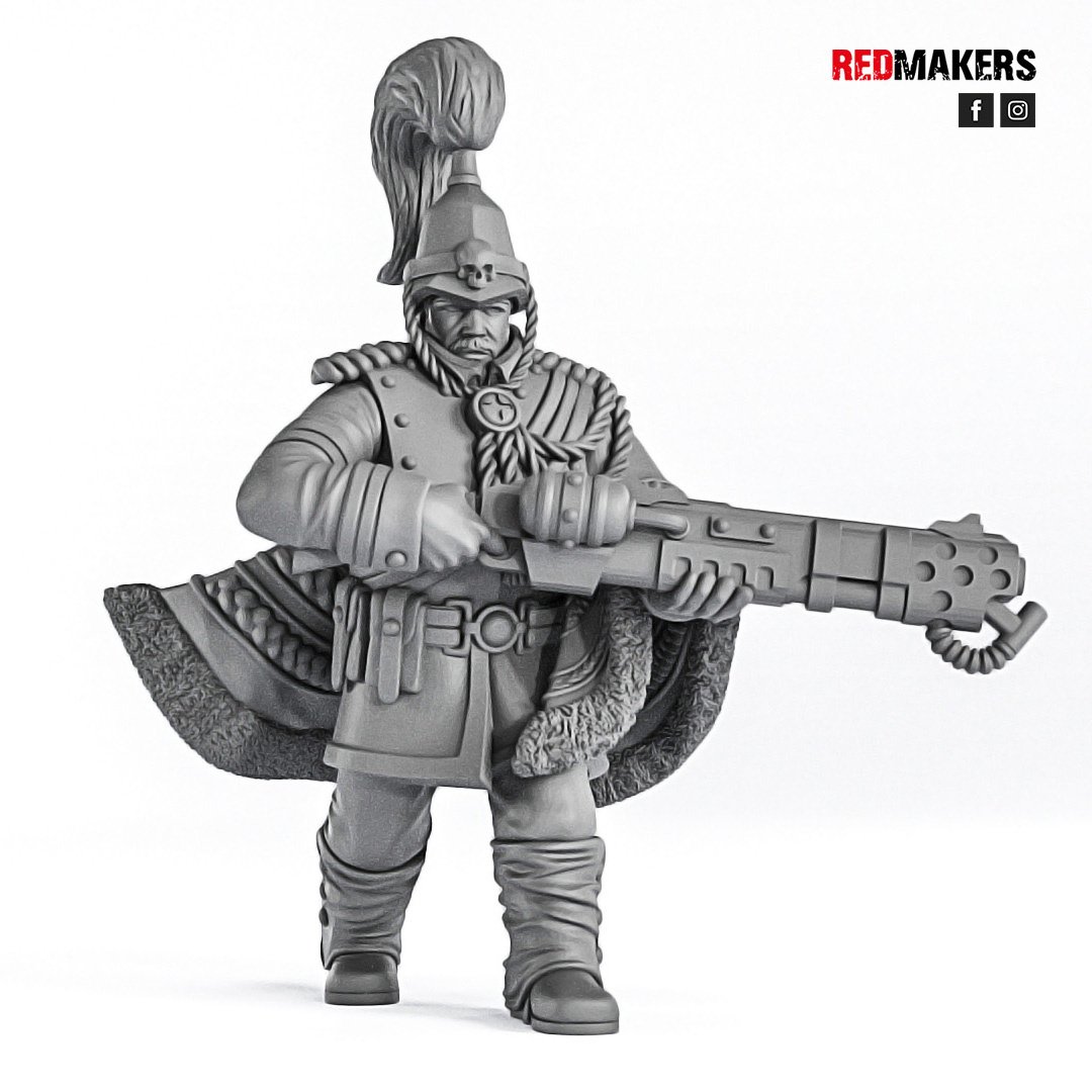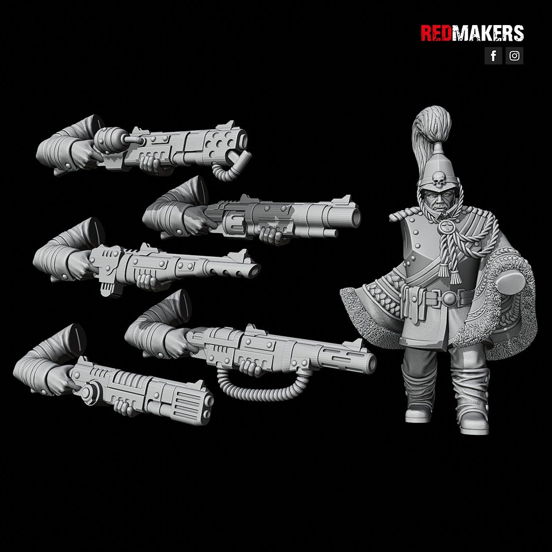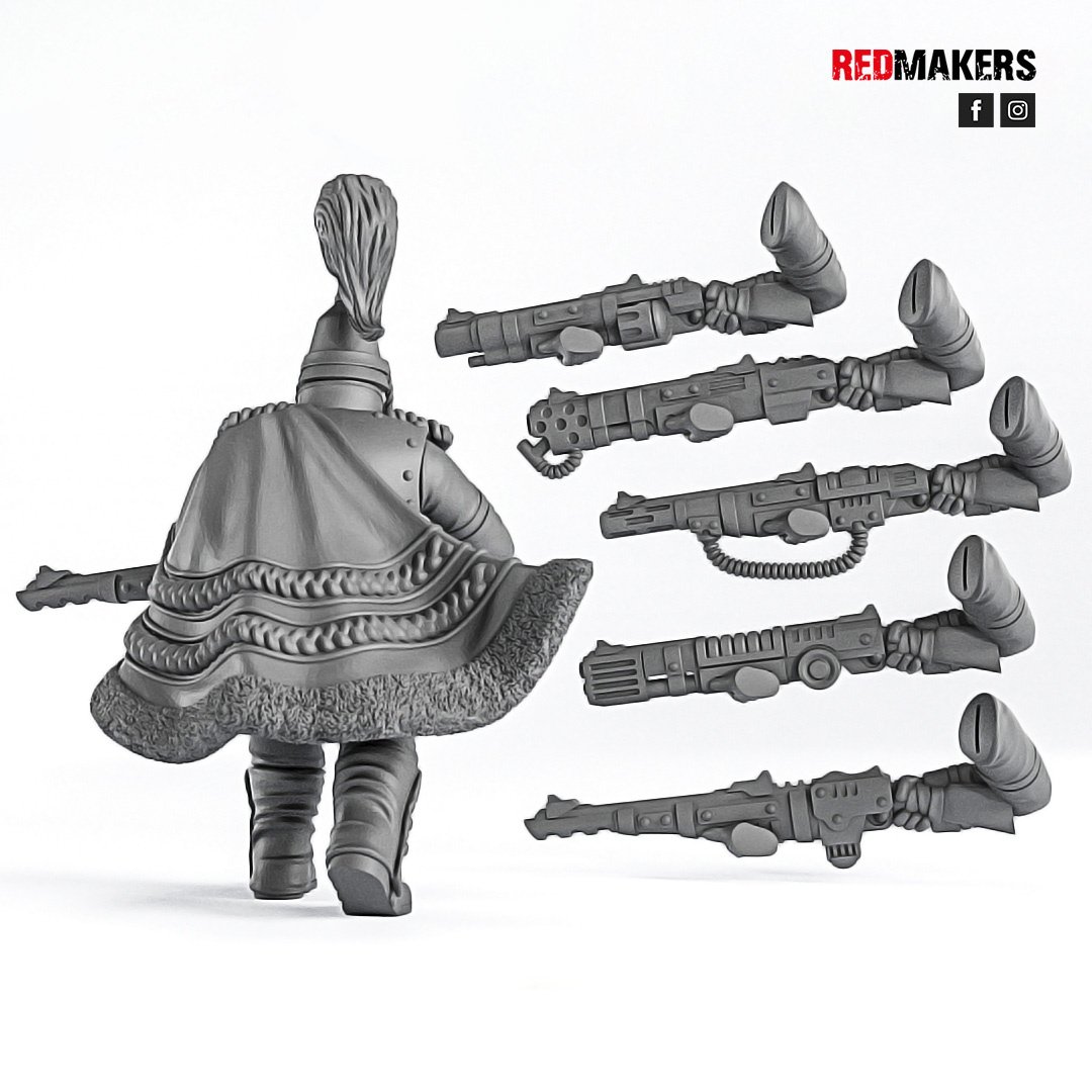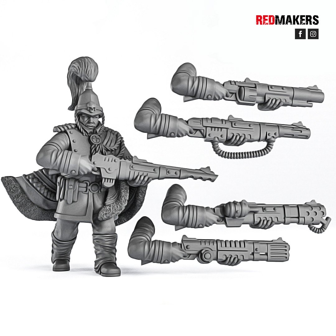 The COMMANDER can be equipped with a LASGUN, a FLAMER, a GRENADE LAUNCHER, a PLASMA GUN, or a MELTGUN.