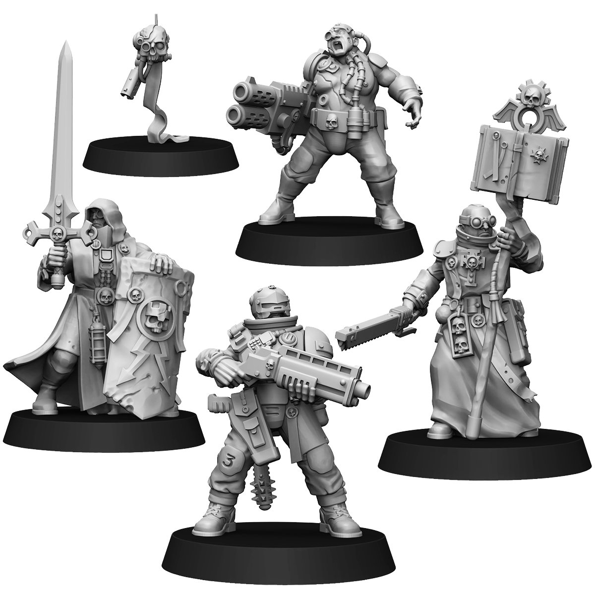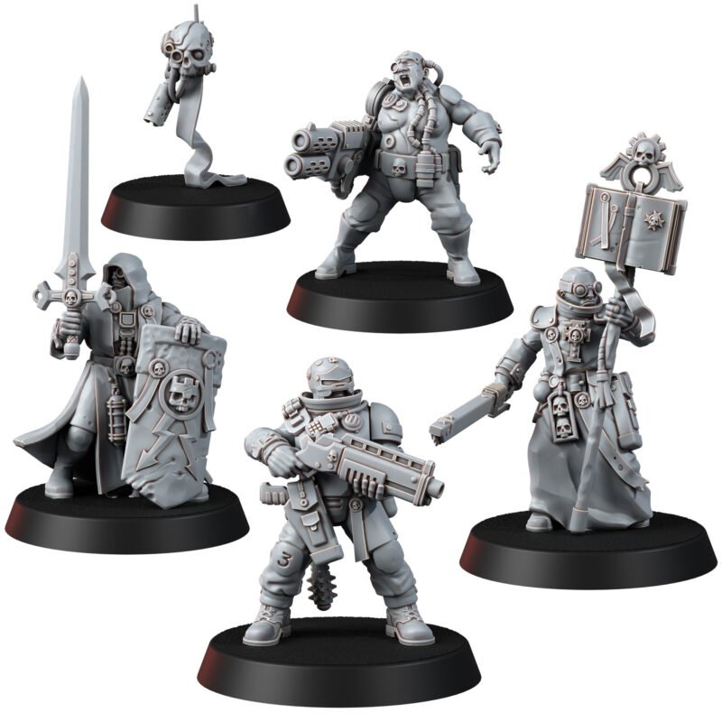 Usually, the composition of the interrogator’s retinue depends on the task assigned to it. Most often, the group includes a Duellist, armed with a power sword and shield, a Missionary full of radiant faith, the Grunt who provides fire support and experienced Case Officer armed with a shotgun and powermace. The reconnaissance function is performed by a Skull-drone. Such a retinue is the most balanced and advantageously complements the skills of the interrogator himself, and all of them together represent a very formidable combat and operational unit.