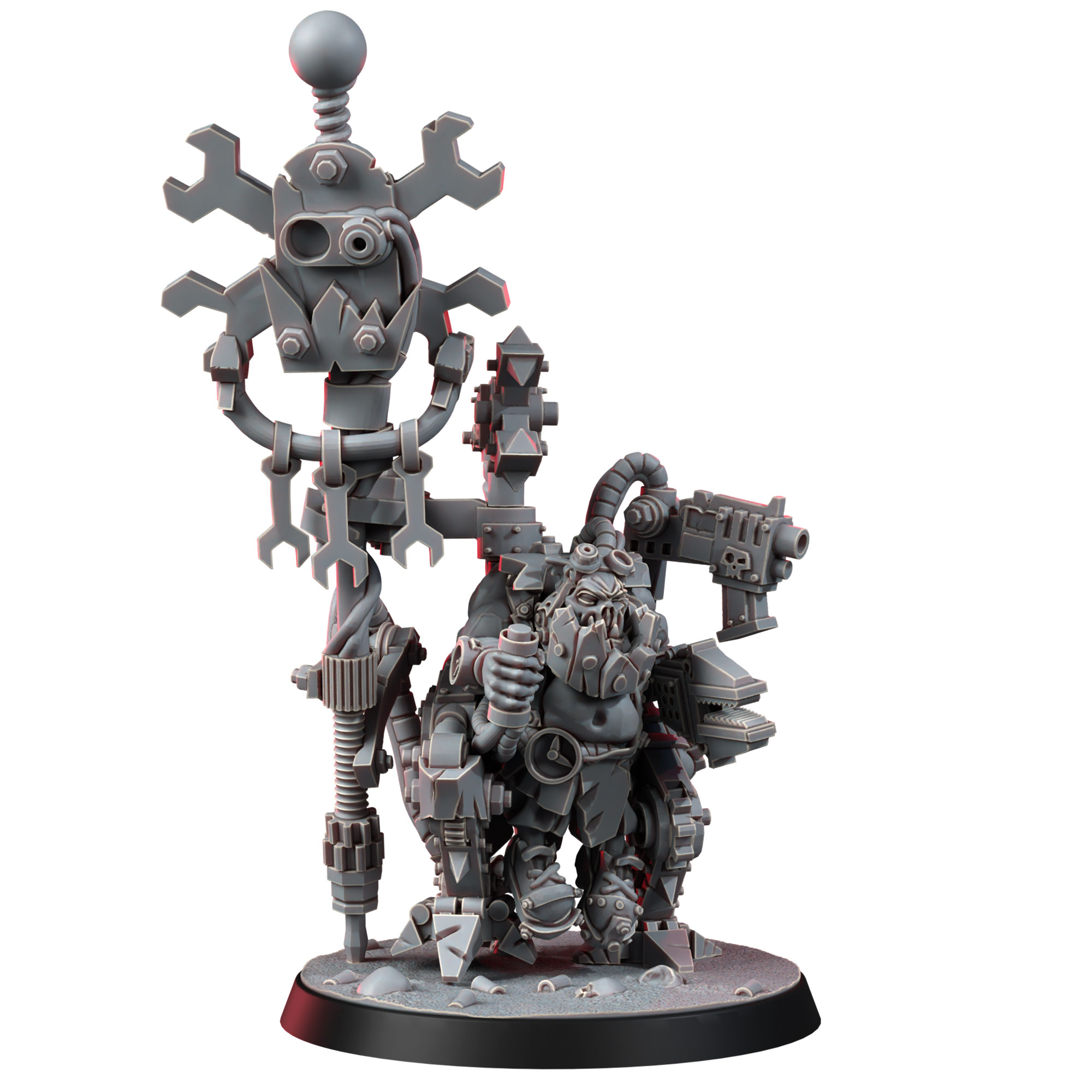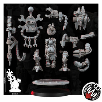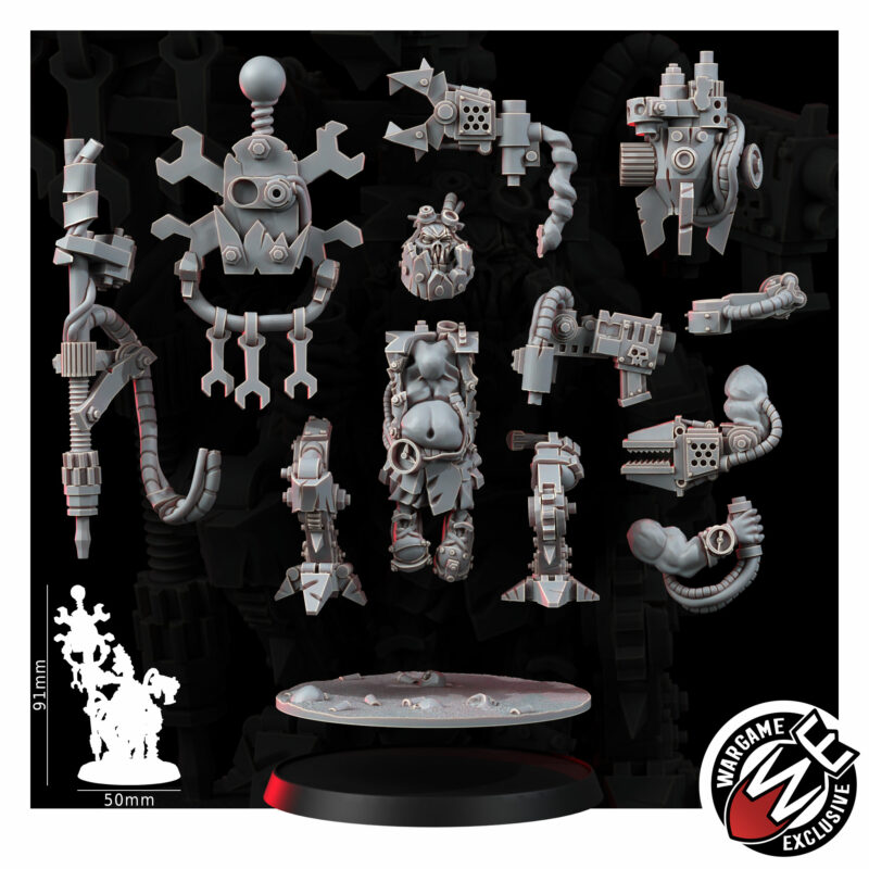 BADMOOD was never a typical Ork. No one wanted to deal with him – not just because of his perpetual bad mood, but also due to his physical limitations. After a failed explosive experiment, he hurt both legs, and later his left arm during a quarrel with the chief Dok when he tried to “help” by telling him that he had “misaligned the cog”. To make matters worse, he lost his left eye in the same brawl with the Dok, who wasn’t too fond of BADMOOD’s “suggestions”. But instead of seeing this as a defeat, BADMOOD decided that a true Mekboy doesn’t need those “boring standard bionics”.